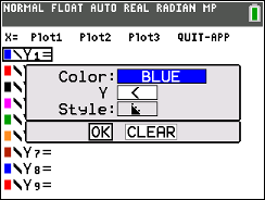 • From the graph entry screen, arrow left until a box is formed around the color and the line choice to the left of Y1.